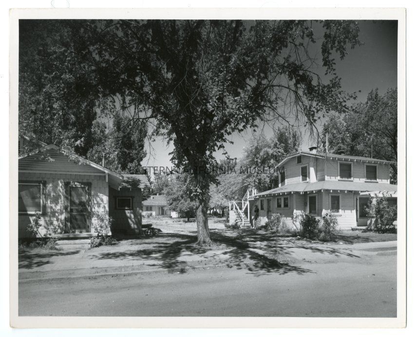 Photo of a residential street showing sidewalk, trees, lawns, and houses. Probably Bishop? Stamped on back by Curtis Phillips of Bishop.