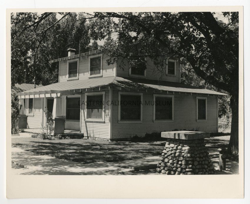 Photo of a residential street showing sidewalk, trees, rock or stone tower, fire hydrant, and houses. Probably Elm Street in Bishop?
