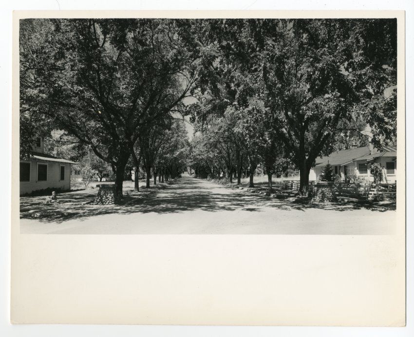 Photo of a residential street showing sidewalk, trees, rock or stone towers, road, and houses. There is a small boy and dog sitting on the lawn in the first house on the right. Probably Elm Street in Bishop?