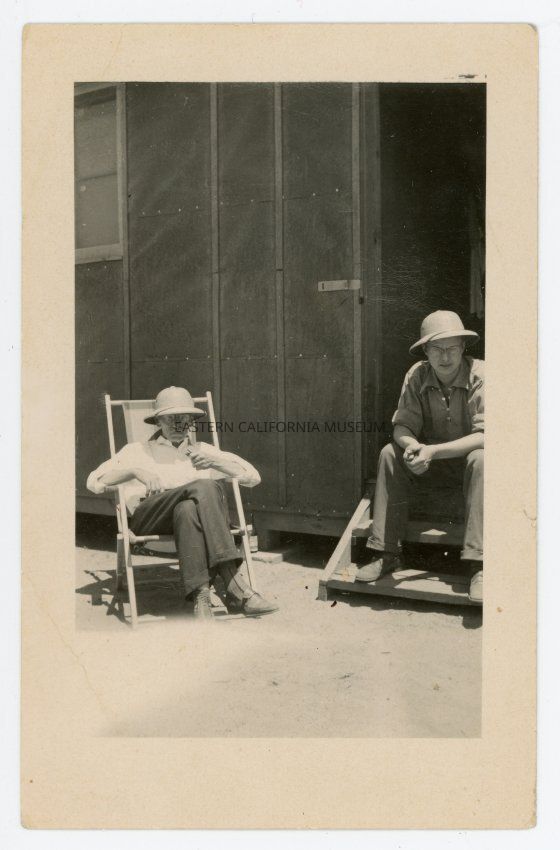 Black and white photo of two men sitting outside a barrack at Manzanar War Relocation Center wearing what appears to be pith helments. This photo was likely taken during Memorial Day of 1942.