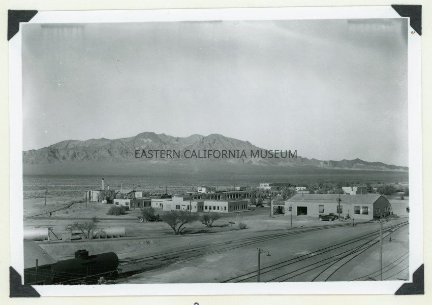 Photo of Death Valley Junction. There are signs for Pacific Coast Borax Company and Richfield Products. Train tracks in foreground. Note says this photo is by Frasher and has is ID #A-9900.Made/Created