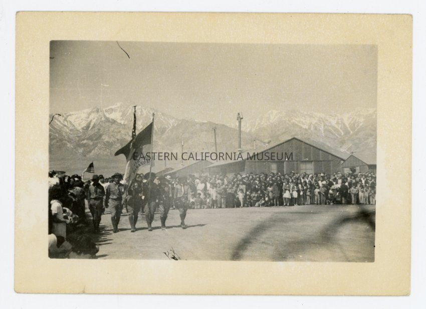 Black and white photo of an outdoor Memorial Day event at Manzanar War Relocation Center. Features a row of men marching in unison, holding flags, while a large crowd of Japanese-American internees observe. Barracks and Sierra Nevada mountains in background.