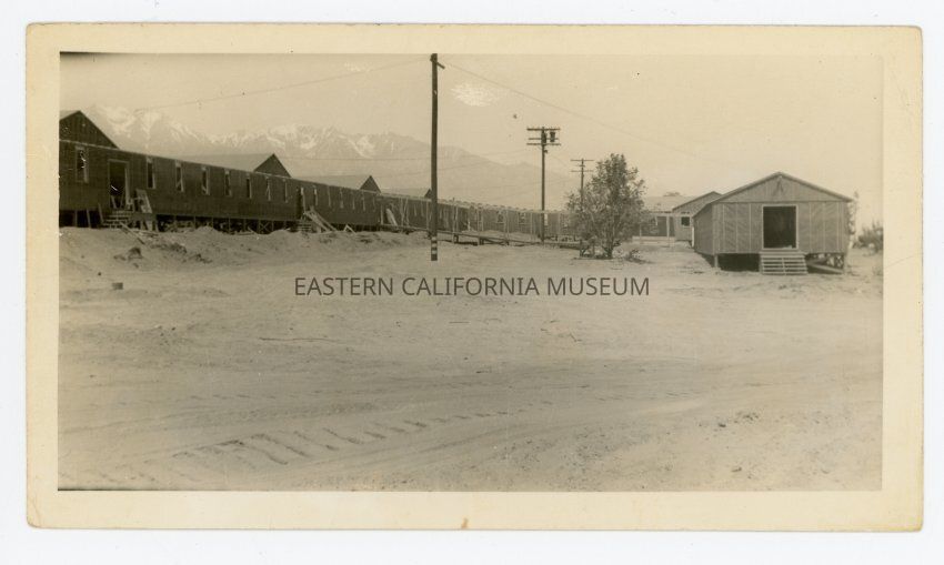 Black and white photo of barracks at Manzanar War Relocation Center. They almost appear to form a wall or a continuous chain of barracks. Barracks, telephone poles, and Sierra Nevada mountains in background. This photo was likely taken during Memorial Day of 1942.