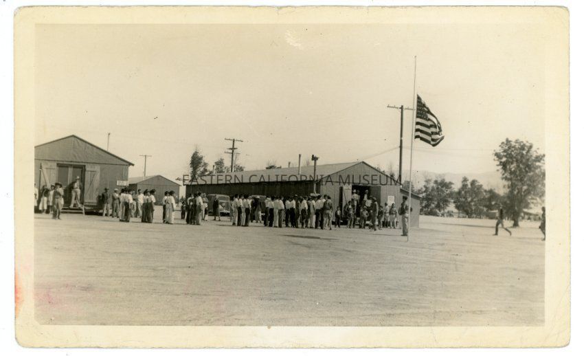 Black and white photo of men (military men or Japanese-American internees?) wearing matching white shirts and dark pants standing in front of barracks and the American flag at Manzanar War Relocation Center. This photo was likely taken during Memorial Day of 1942. Telephone poles and trees in background.