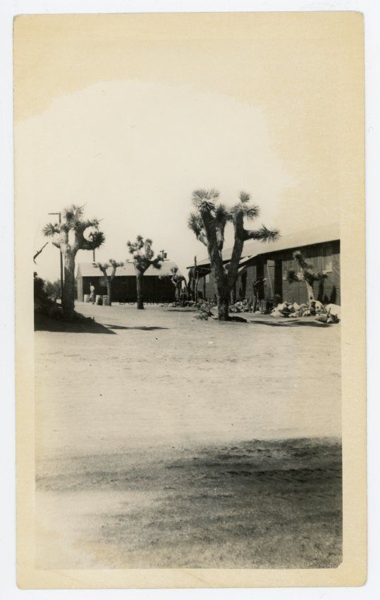 Black and white photo of barracks and yucca or joshua trees at Manzanar War Relocation Center. The photo has some discoloration. The rest of the photos in this collection were taken during Memorial Day of 1942.