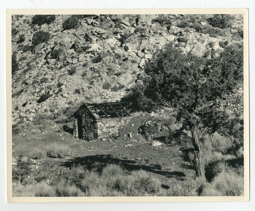Photograph of a ruined stone structure at the foot of a hillside. Roof is completely gone. Written on back: Shack at Panamint City.