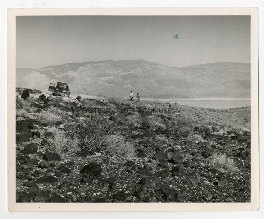 Photograph of three people (man, woman, and child) walking towards a car, whose door and trunk are open. Lava stone in the foreground, mountains, possibly a valley or dry lake bed in distance.