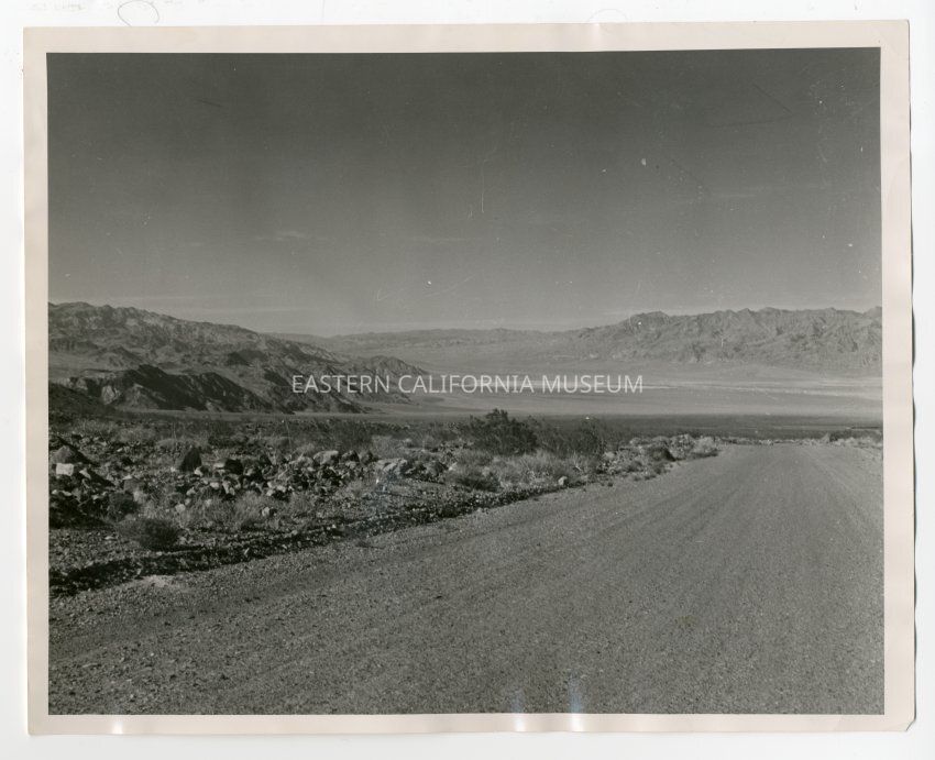Desert landscape photograph showing a dirt road, a dry lake or valley in the distance, and mountains. Possibly somewhere in Death Valley?