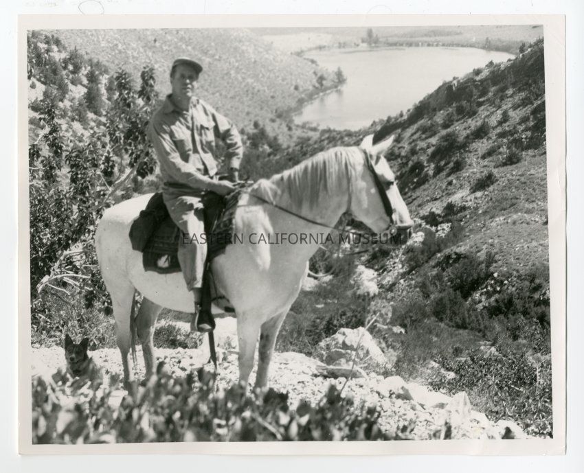 Out of focus photograph of Judge Bill Green on horseback. There is a dog behind the horse and a lake in the background. Maybe on a pack trip?Collection