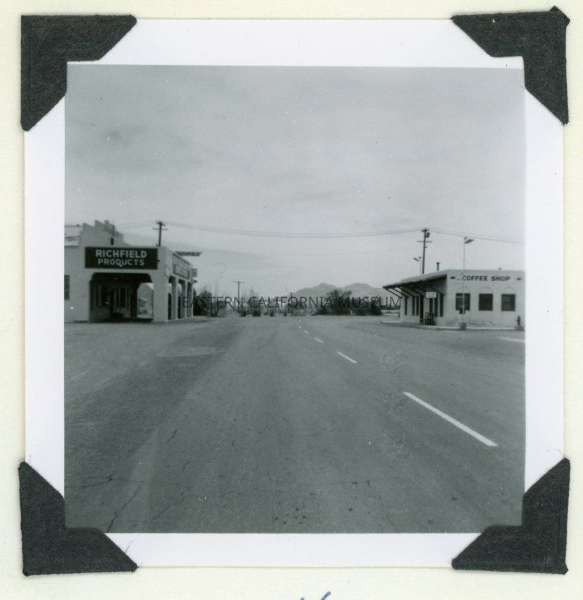 Photo of Death Valley Junction looking south on highway 127 on 5/24/1958. Building on the left has a sign for Richfield Products and the building on the right is a coffee shop.Made/Created