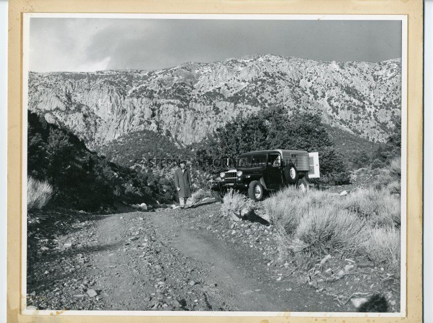 Mounted photograph of a man in a long coat and hat standing next to a vehicle with a camper shell. Dirt road in foreground.