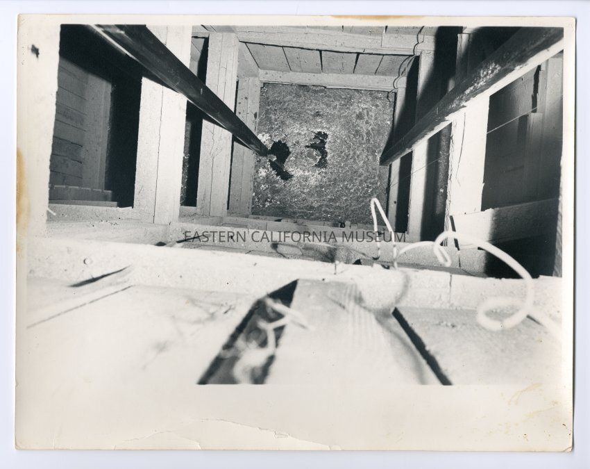 Photo labeled on reverse: "7/6/2019 Bottom of mine (Red Mountain? Panamint Valley?) c. 1961. 700 ft. down, 300 ft. of water. Doanted by Glen McDonald." Photo of scummy water at the bottom of vertical mine shaft.Collection
