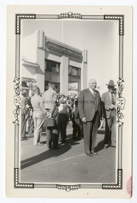 Black and white photograph with decorative frame taken during the Wedding of the Waters celebration in October 1937. This photo is of Governor Merriam and a crowd in front of Bank of America in Lone Pine. There is a red spot in the lower right hand corner.