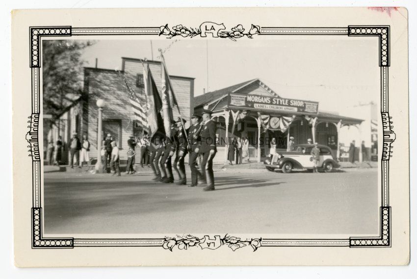 Black and white photograph with decorative frame taken during the Wedding of the Waters celebration in October 1937. This photo is of the color guard during the parade in Lone Pine when they are passing in front of Lottie Dearboorn's Rooming House. Morgan's Style Shop and a vintage automobile are also visible in the background. There is a spot of red in the upper right corner.