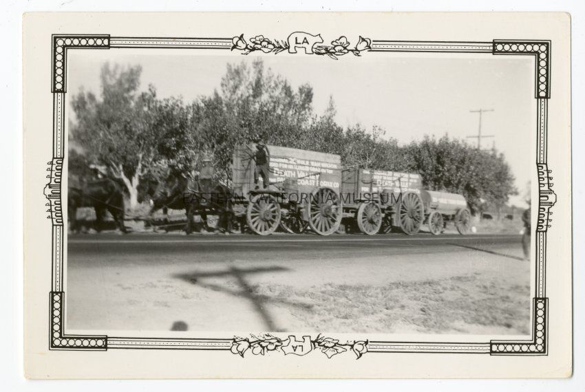 Black and white photograph with decorative frame taken during the Wedding of the Waters celebration in October 1937. This photo is of the borax wagons being hauled down the road (around Lone Pine?) by the 20-mule team.