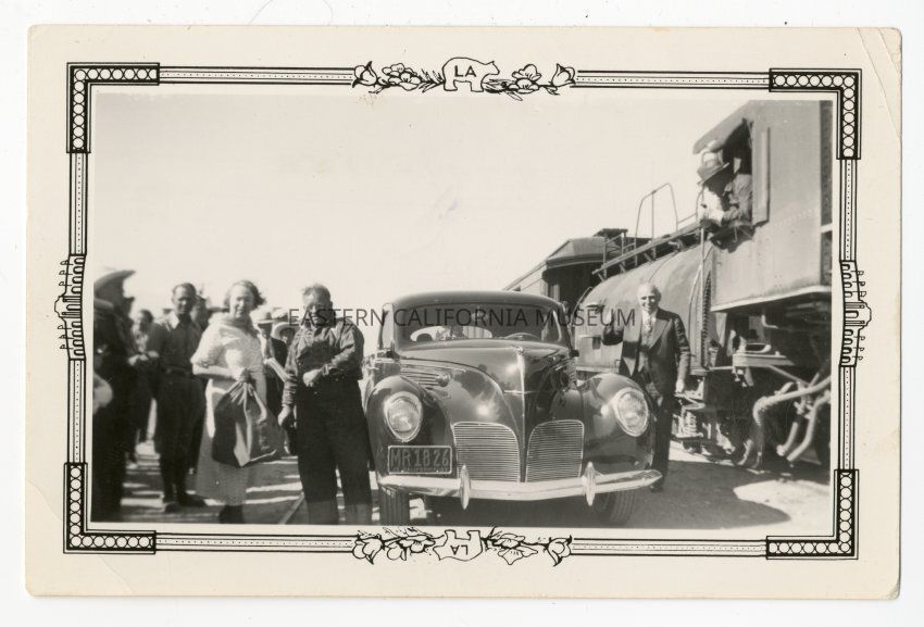 Black and white photograph with decorative frame taken during the Wedding of the Waters celebration in October 1937. This photo is an automobile parked alongside the train, with Lillian Hilderman holding the mail pouch. Governor Merriam is standing between the automobile and the train.