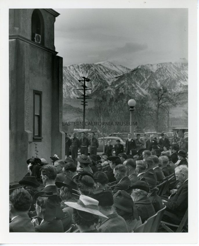 Black and white photo of the funeral service for Father Crowley at Santa Rosa Church in Lone Pine in March 1940.