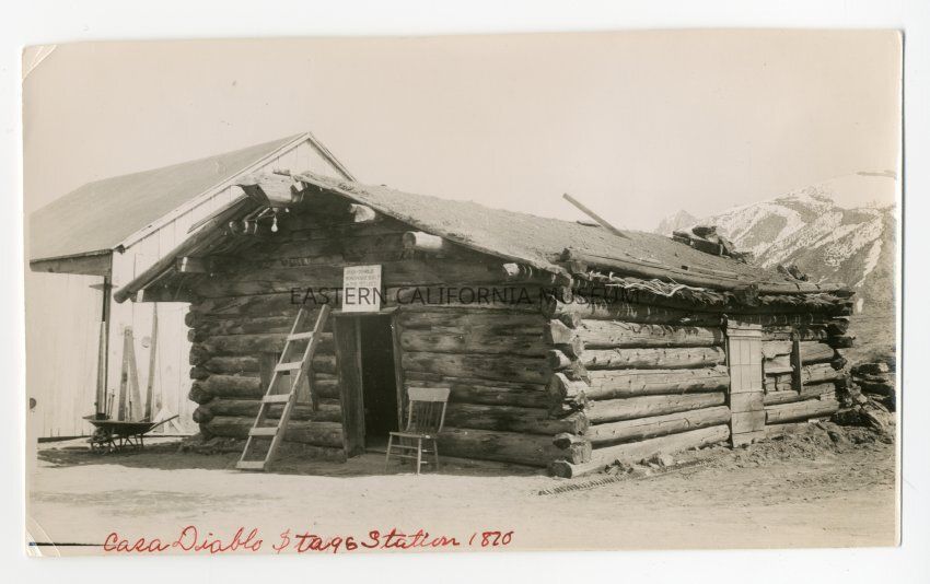 Photo of a log building with a chair and ladder near the front door. There is a sign over the door that says, "Casa Diablo Roadhouse built in the 70s [1870s] used as a saloon and stage depot by pioneers. There is a wood building with a peaked roof behind it. It is labeled on the bottom in red ink, "Casa Diablo Stage Station 1870."