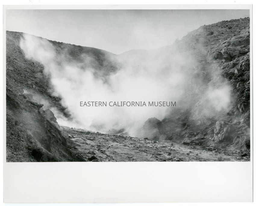 Black and white print of steam rising from the ground in a rocky, hilly location. Likely Coso Hot Springs region. On reverse: "4462"