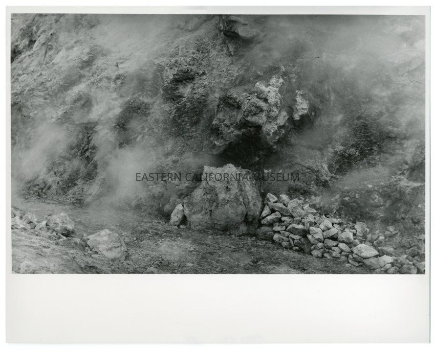 Black and white print of steam rising from the ground in a rocky, hilly location. Likely Coso Hot Springs region. On reverse: "4460"