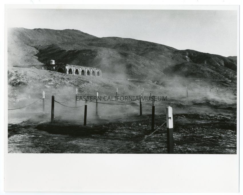 Black and white print of a stone structure and roped off areas where steam is rising from the ground. Likely Coso Hot Springs region. On reverse: "4445"