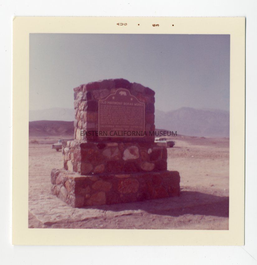 Color photo of a stone monument with plaque marking the Old Harmony Borax Works.