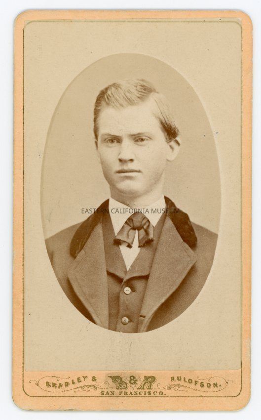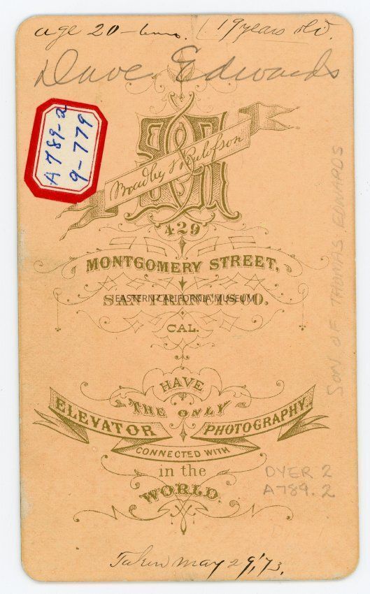 Small photograph affixed to card of Dave Edwards, son of Thomas Edwards. The photo was taken on May 29, 1873 when he was age 19 or 20. Photo by Bradley and Rulofson of San Francisco. The card is highly decorated on the reverse.Made/Created