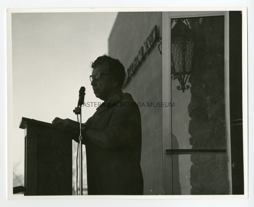 Photo of Dorothy Cragen giving a speech in front of the "new" Eastern California Museum building.