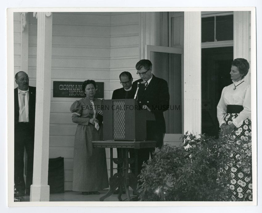 Handwritten on reverse: Commemoration of March 26, 1872 earthquake at Commander's House. L to R: Victor Wisehart of Big Pine, E. Ca Museum Bd. member, Josia Lee and Rev. Chas. Mitchell, Meth. Ch., former Inyo Co. Administrator John K. and Tansy Smith.