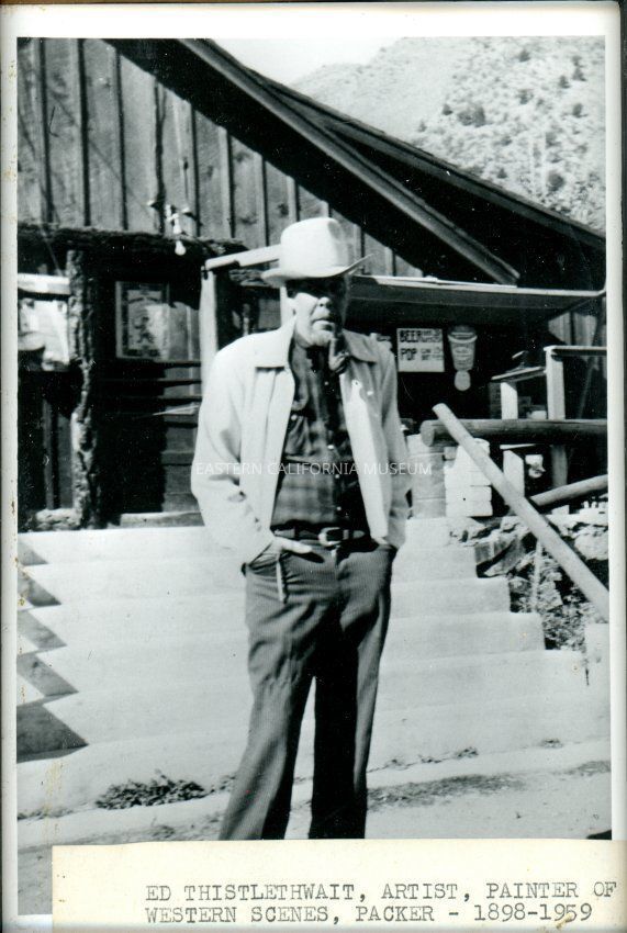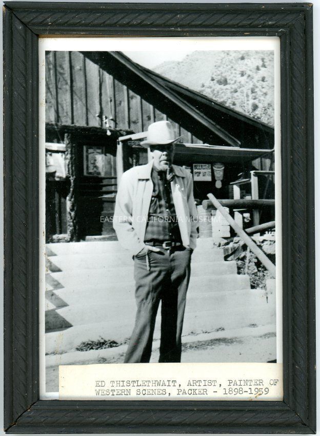 Framed black and white photo of Ed Thistlethwaite, artist, painter of western scenes, packer, 1898-1959. There is a typewritten label at the bottom. He is wearing a light colored hat and standing in front of a wooden building with concrete steps leading up to it (maybe a resort or lodge in the Sierras). Advertisement in background for beer.