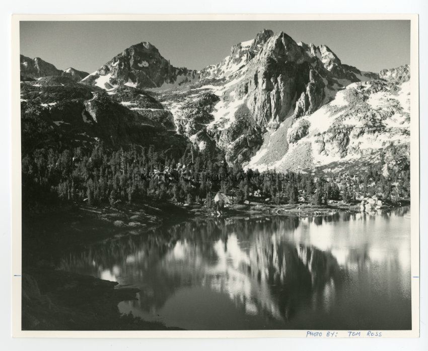Photo of a lake with trees and mountains in the distance. Handwritten on reverse: Rae Lake.