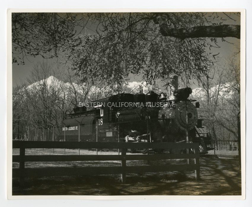 Photo of Southern Pacific engine no. 18 at Dehy Park in Independence. The tender car has "Carson & Colorado Ry." written on the side.