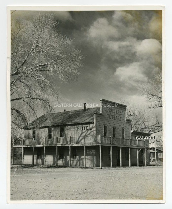 Photo of a two story hotel called the "Drovers' Cottage." Has signs for saloon and hotel. This building is part of a movie set constructed at Laws. Photo is likely taken by Tom Ross.