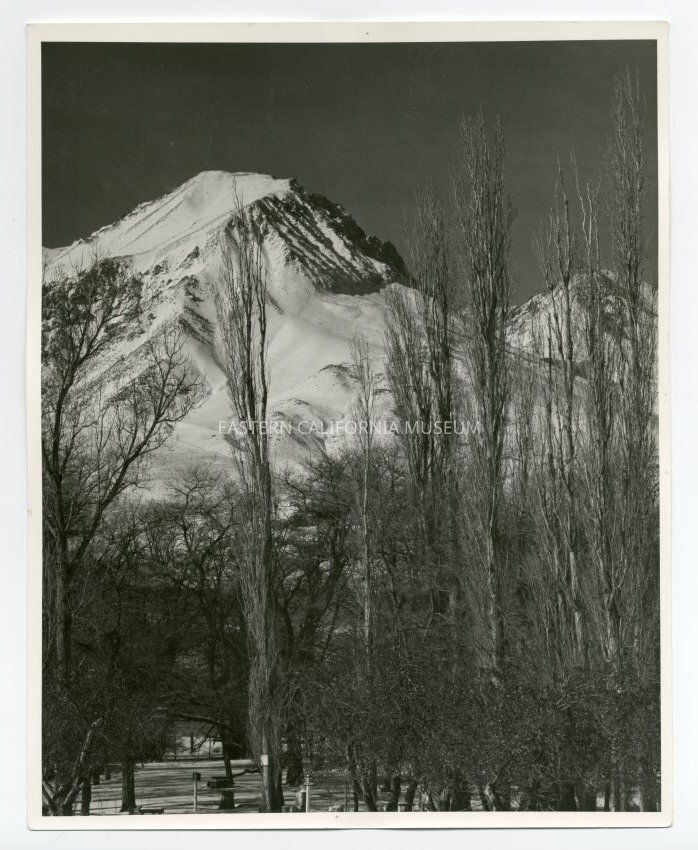 Photo of Tinnemaha campground showing trees and mountains in distance. Photo is likely taken by Tom Ross.