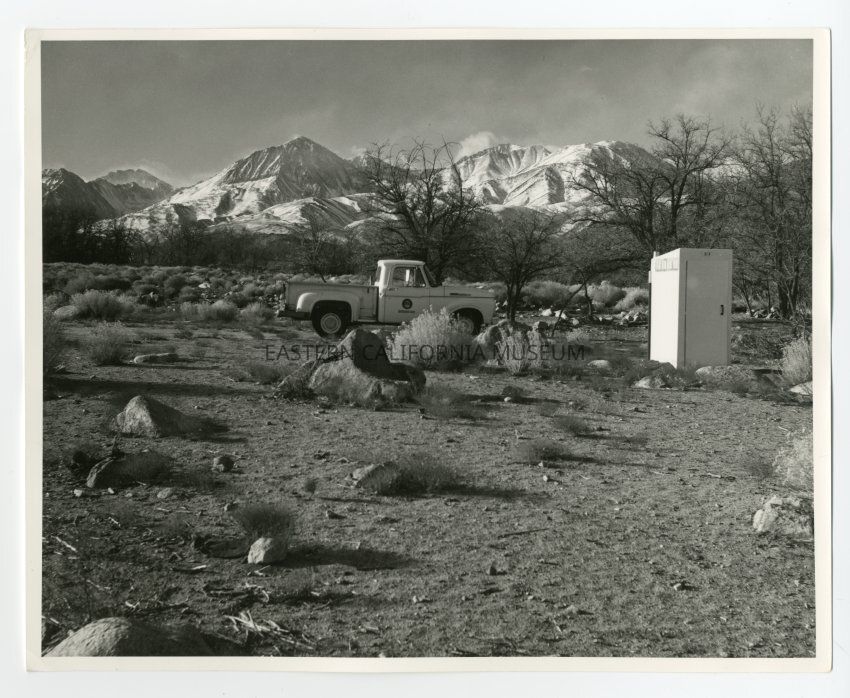 Photo of Baker Creek campground with an Inyo County truck parked in center. Photo likely taken by Tom Ross.
