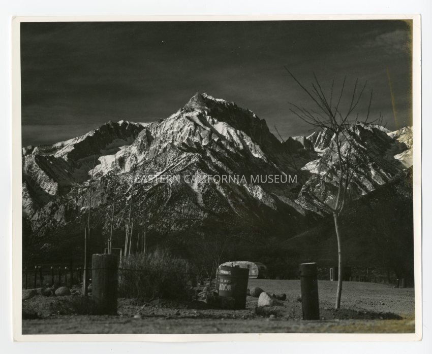 Photo of Indpendence Creek campground with Mt. Williamson looming in the background. There is a RV trailer parked near the center of the photo.