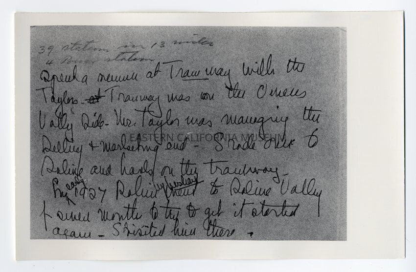 Photo of a page (#3) from a letter or memoir written March 14, 1970 by Margret Smith Wilson. It says, "...spent a summer at tramway with the Taylors. Tramway was on the Owens Valley side. Mr. Taylor was managing the selling and marketing end. I rode over to Saline and [illegible] on the tramway. In early 1927, Robin, my husband, went to Saline Valley for several months to try to get it started again. I visited him there."