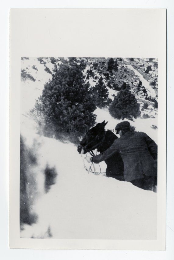 Photo of a man and horse in deep snow. The man's back is turned to the camera.Collection