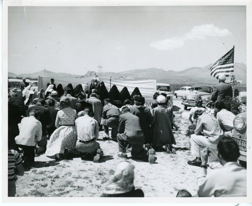 Included with the photo is a typed note from Helen Gunn that says, "Memorial to the Padre of the Desert / Palm Sunday 1954 / Left to right: Helen (small hat) behind girls with veils, Pat Cole (man leaning against car), Mrs. Jack Warner (kneeling, small hat), Leland Abel, sisters, Father George Crowley (brother of the Padre, at elevation of host), Sister Petra (the Padre's sister, at right end of the Sisters). The photograph does not give you the true number of those who were there. There were hundreds."