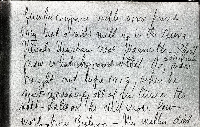 Photo of a page (#10) from a letter or memoir written March 14, 1970 by Margret Smith Wilson. It says, "...lumber company with some friend. They had a sawmill up in the Sierra Nevada Mountains near Mammoth. I don't know what happened to that. He and his friend were bought out before 1912, when he spent increasingly all of his time on the salt. Later on he did more law work from Bishop. My mother died [sentence continues on next page]."Collection