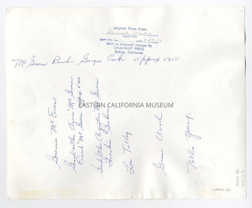 Stamped on reverse by Chalfant Press. Says the original photo is from the Gussie Wood Collection, dated 7-27-70.