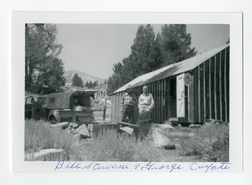 Photo of two men standing by a cabin (looks similiar to Manzanar barracks). There is a truck with an open camper in the background. It looks like they are camping. Written beneath the picture is, "Bill Steward and George. Coyote."