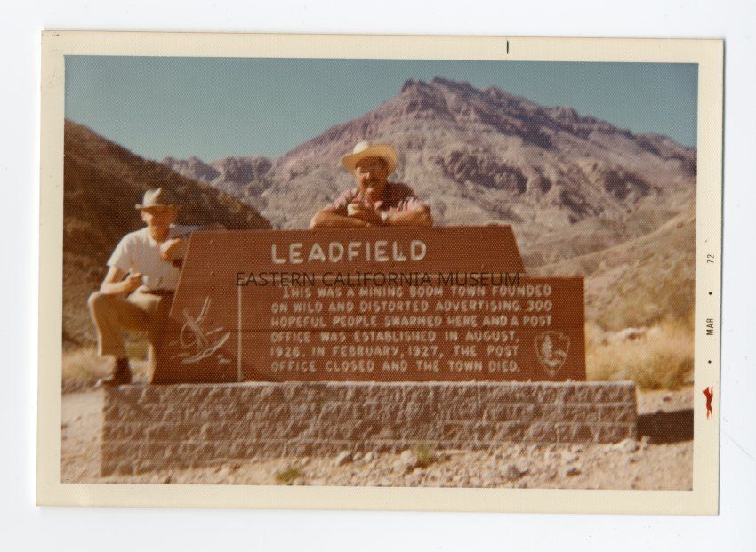 Color photo of two men posing next to the sign for Leadfield. It says, "This was a mining boom town founded on wild and distored advertising. 300 hopeful people swarmed here and a post office was established in August, 1926. In February 1927 the post office closed and the town died."