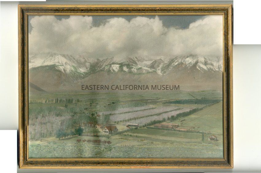Framed, hand-tinted photograph of the Red Mountain Fruit Ranch (located west of the Tinnemaha campground and south of Big Pine). It shows packing sheds, houses, and out buildings with the snow-covered Sierra Nevada mountain range in the background. The photo was taken by Harry W. Mendenhall and it was hand-tinted by Edith May Mendenhall.Photograph Details