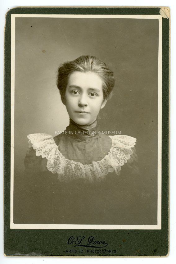 Old label says: May Johnson (Mrs. Jules Conterno). Daughter of Charlie Johnson who was Lone Pine pioneer and had ranch at location across the road from Death Valley turn-off south of Lone Pine. Niece of A. H. Johnson, who climbed Mt. Whitney in 1873. Her father waiting in camp.Collection