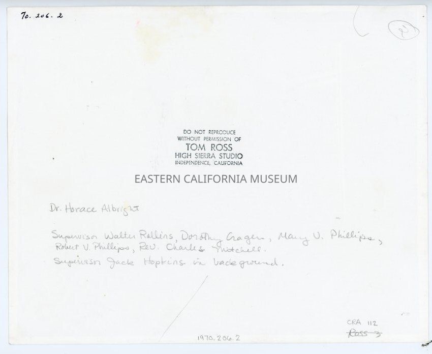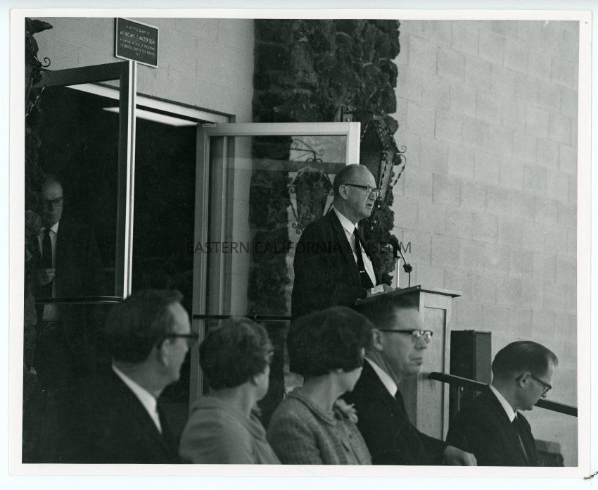 Photo taken during the Eastern California Museum dedication on April 7, 1968 showing Dr. Horace M. Albright speaking at podium. In forgeround are: Supervisor Walter Rollins (Museum Trustee), Dorothy Cragen, Mary V. Phillips, Robert V. Phillips, and Rev. Charles Mitchell. Jack Hopkins (the event's M.C.) is in the doorway in the background. Tom Ross took the photo.