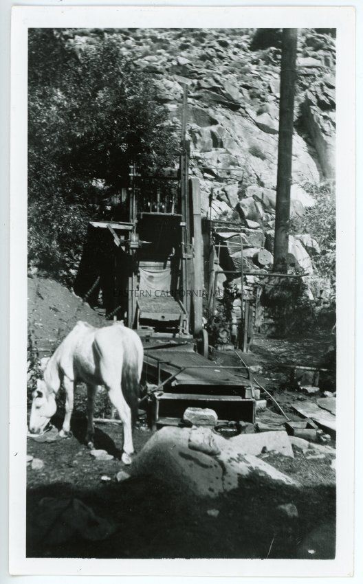 Black and white photograph of a white horse standing near what appears to be mining equipment (stamp mill?). Rocks, hillside, tree in background.