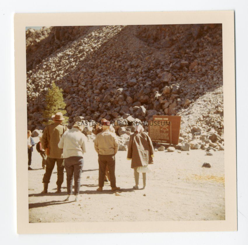 Small color photo taken during a museum field trip in September 1968 to the Mammoth Lakes area to see the glass flow, Inyo Craters, Minaret overlook, and the earthquake fault. This photo is of a group of people in front of an informational sign for Obsidian Dome.Collection