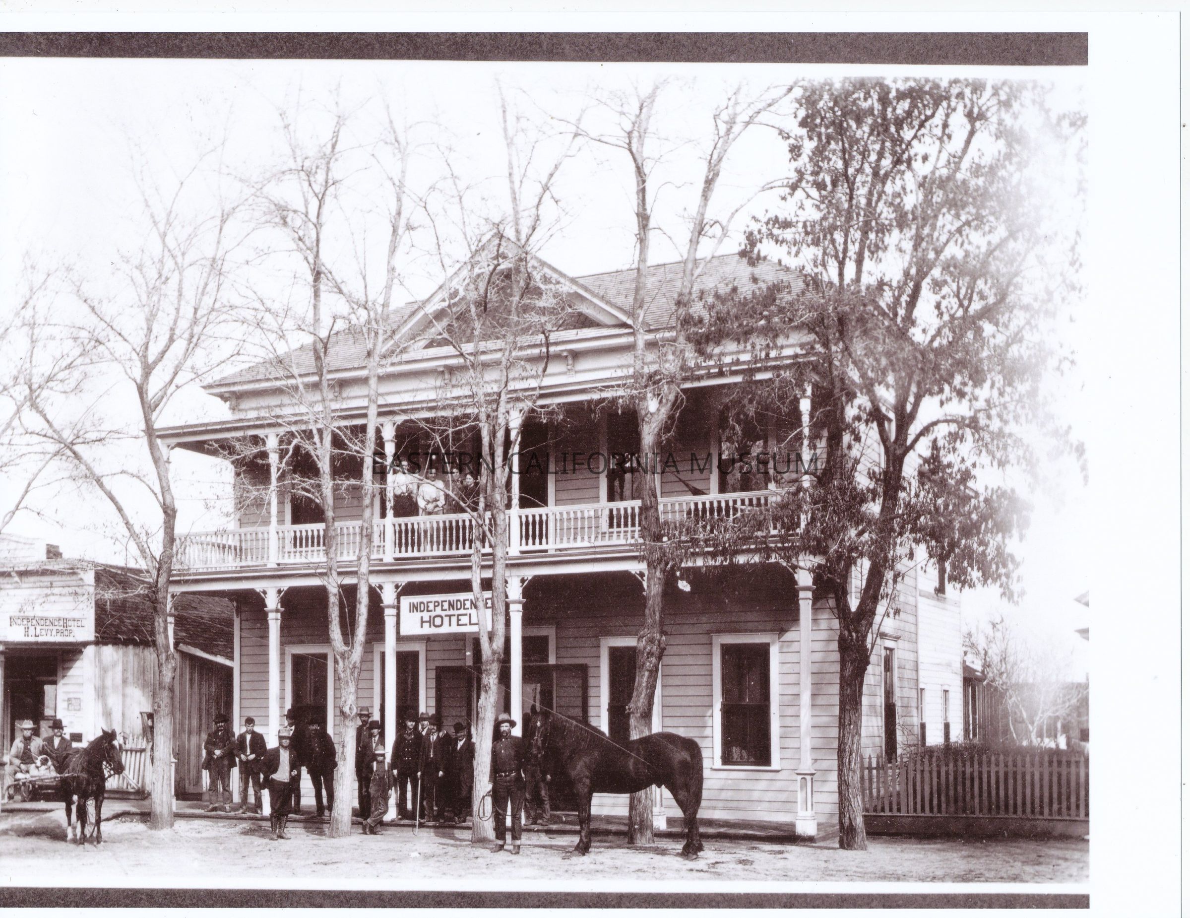 Photograph (copy) of Independence Hotel. Four women are standing on the balcony above a sign that says, "Independence Hotel." On the street in front of the hotel are fourteen males, one large black horse, and on the left is a wagon with two men sitting in it and a single horse hitched to it. A sign to the left side says, "Independence Hotel, H. Levy Prop."Collection