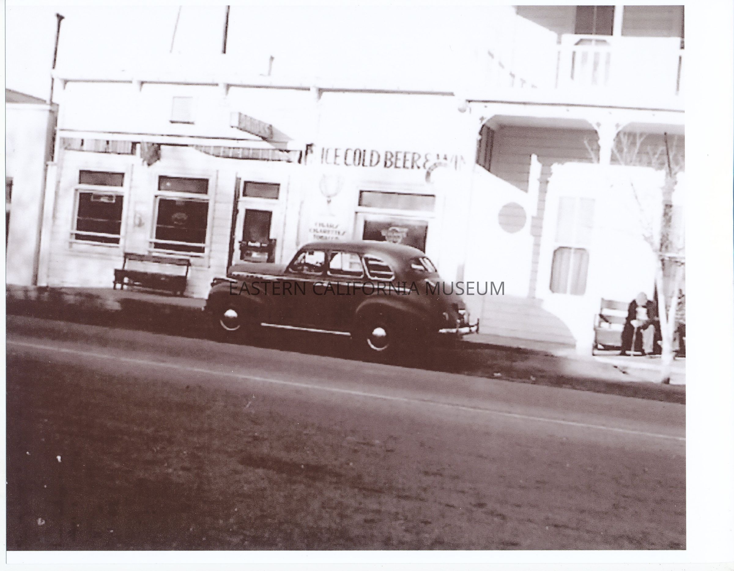 Photograph (copy) of the Independence Hotel. The original photograph was taken during WWII. There is a dark colored car on the street and a section of the hotel is visable on the right. The street has been paved. The photo is washed out, but a sign saying "ice cold beer" is visible.Collection